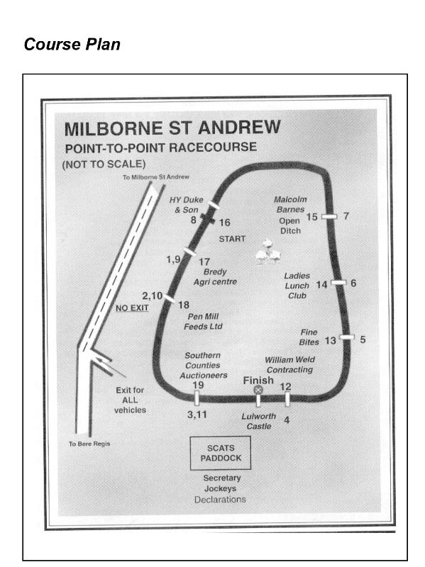 An undulating course over pasture on chalk. Slightly uphill home straight. Races held over three miles comprise of 2 ½ circuits. The fences are very well built and comprise of portable fences.